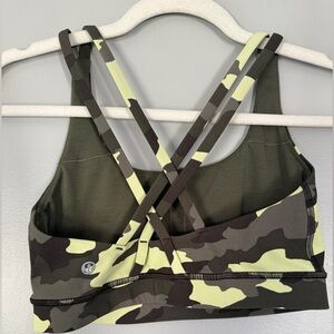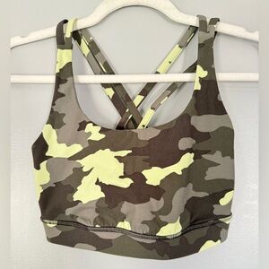 Stylish camo sports bra and leggings set. Features a green and black pattern.