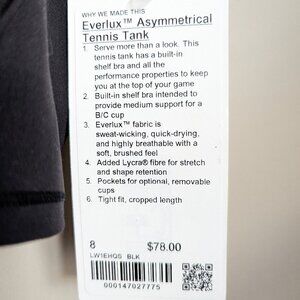 Lululemon Everlux Asymmetrical Tennis Tank Top in Black - Size 8 - NEW WITH TAGS!