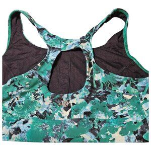 Everlux Train Bra Medium Support, C/D Cup. Urban Undergrowth Kelly Green Multi. Wide straps and back key hole opening. Designed for training. Sweat-wicking. Pockets for removeable cups (not included). Size 12 confirmed by size dot and receipt.