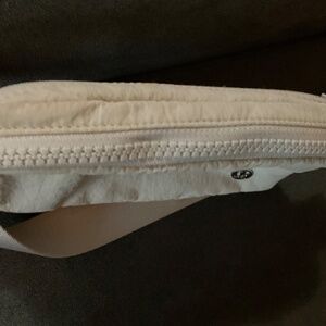 Lululemon Everywhere crossbody or waist pouch. Two external zippered pouches. Off white colour. Very good condition. No flaws that I can see. Measurements are shown.