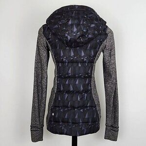 Excellent pre-owned condition, Lululemon Fluff Off pullover down filled hoodie jacket in Stained Glass Love Nightfall black, size 4.