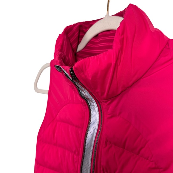 Stay cozy and stylish with this Lululemon Fluffed Up Vest in a vibrant pink shade. Designed with lightweight insulation and quilted panels, this vest is perfect for layering during runs, workouts, or casual wear. Features a full zip front with chin guard, zippered hand pockets for secure storage, and a flattering athletic fit.