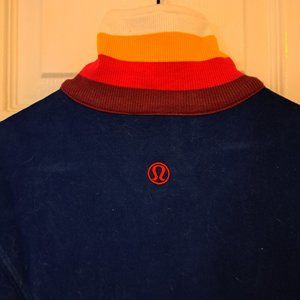 Lululemon retro style track jacket Size: Small - I would say it is true to size High. zip-up collar with bright colours/ Body of jacket is navy blue There is very little stretch to this jacket, but it is made of a high quality thick cotton and very soft. Worn a handful of times, but in very good condition.
