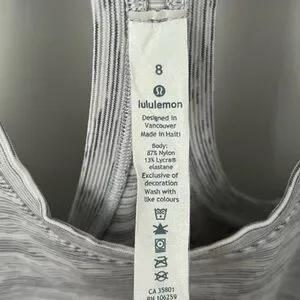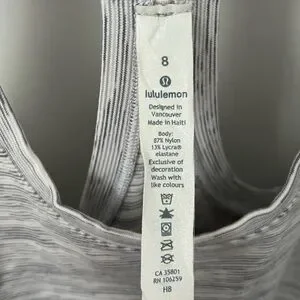 Lululemon. Size 8. Gray pattern racer back tank top. Made of 87% nylon and 13% lycra elastane. Lightly worn, in great condition, see photos for reference. Feel free to comment any questions you may have and I will try to respond as soon as possible.
