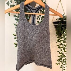 Stylish gray racerback tank top. Perfect for workouts or casual wear.