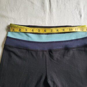 Flared leggings with vibrant chartreuse, aqua, navy stripes at waist.