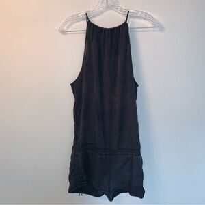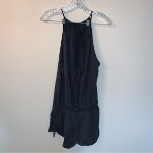 This gray jumpsuit from lululemon athletica features a chic halter-style neckline and a fitted waist, offering a relaxed silhouette through the shorts. Crafted from lightweight fabric, it is perfect for versatile, warm-weather wear