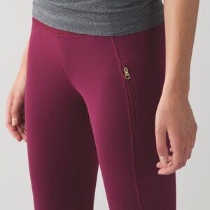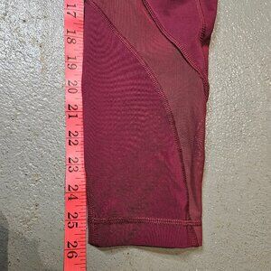 7/8 length run pants. Fun pattern on the inside of the waistband. Colour is called Dashing Purple but I would say they're more maroon.