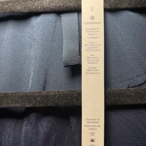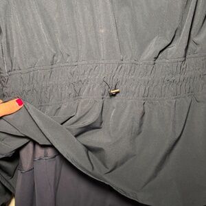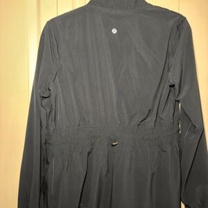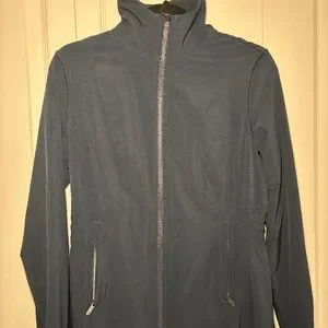 Navy front zip jacket with zippered pockets. Jacket interior and pockets are lightly lined. Cinched waist detail. Excellent condition - like new.