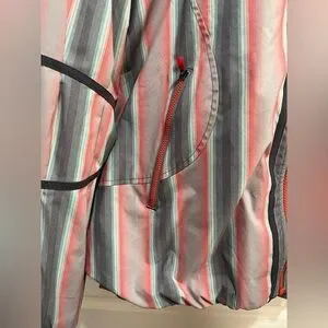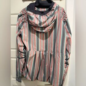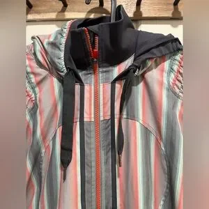 Stylish hooded jacket featuring a vibrant striped pattern. Includes shades of pink, blue, and gray. Perfect for casual wear.