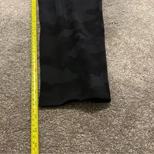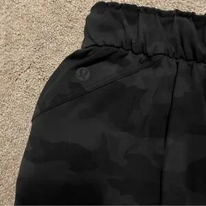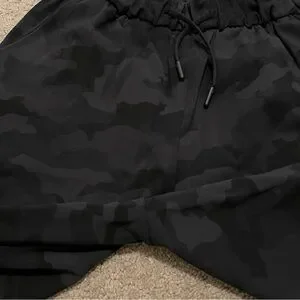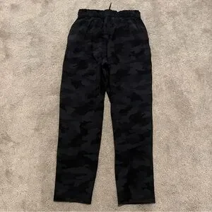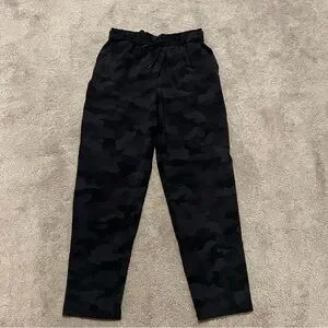 Black camo drawstring pants. Elastic waist with functional tie. Straight tapered leg. Subtle allover camouflage print. Comfortable everyday style.