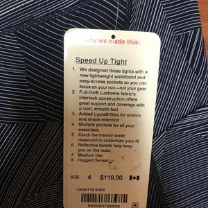 Brand new Lululemon Speed Up Tights in size 4. Unworn because I bought the wrong size :( New with tags!