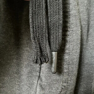 Pre owned flawed condition with some marks on the front and a small hole, missing the end of one drawstring