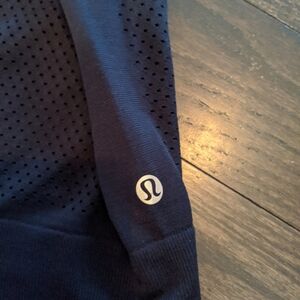 Navy Lululemon tank top with mesh and a fitted hem. It has long arm holes so it fits quite loose and is very airy!