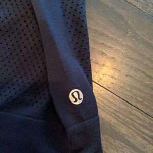 Navy Lululemon tank top with mesh and a fitted hem. It has long arm holes so it fits quite loose and is very airy!