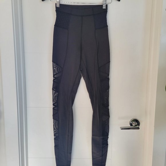 Lululemon high-rise mesh panel leggings. Super flattering but I have too many leggings and I haven't worn them in a while. Size tag torn off but I think they were originally a size 2. Has dot mesh just below the waist band and mixed mesh panels down both legs.