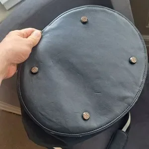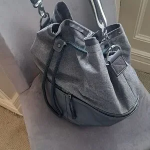 Stylish gray canvas and black faux leather drawstring bag for everyday carry. Features a top drawstring closure and zippered lower compartment for organized storage. Adjustable striped shoulder strap for comfortable wear. Modern, versatile design in gray and black.