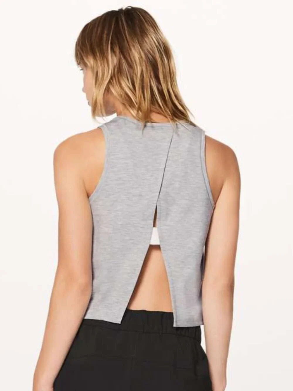 Features: Cropped length, Sleeveless, High neck, Relaxed fit, Deep armholes, Open split back, Overlap panels, Pullover, Lightweight, Sweat-wicking, Quick-drying