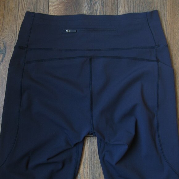 Lululemon Pace Perfect Luxtreme navy tight size 10. They have side pockets and a back zip pocket. There is a very small flaw in an area of the stitching (see last picture), otherwise they are in very good used condition. Waist 14", rise 10", inseam 23.5".