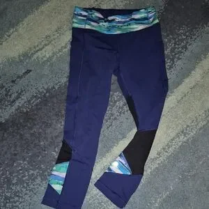 Stylish blue leggings featuring a colorful patterned waistband and black accents. Perfect for workouts or casual wear.