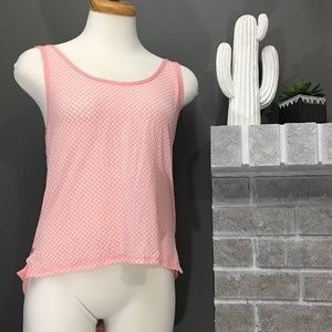 Bright pink high to low tank. Thick straps and a scoop neck. Low back as well to show off your cute sports bra beneath. Soft thin breatheable fabric which is perfect for yoga and working out ect. Really cute pink diamond pattern. Brand new. Pictured with and without flash.