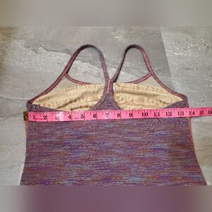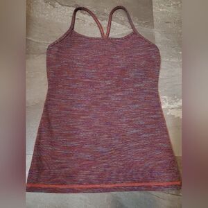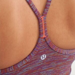 Lululemon Power Y Tank. Striped. Orange, pink, white; Color/pattern is called "Wee Are From Space Black March Multi". Built in bra, non padded. Size 6, see pictures for measurements. Excellent condition. No stain, no rip. Non smoking house.