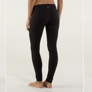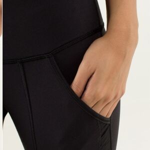 Lululemon Practice Daily Pant. Tights. Satin Ruched Details On Sides. Black. 28" inseam. Size 10, see pictures for measurements. 2 front pockets. Minor piling in the crotch area. No stain, no rip. Non smoking house.