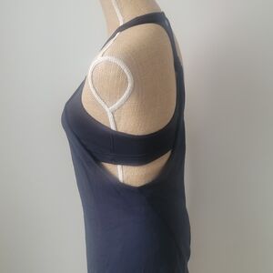 Lululemon Black Tank with Built-in Bra. Style Name: Practice Freely. A Light weight black loose long tank with pleated bottom, gathers in the back with the sports bra. Black sports bra built-in, black living .