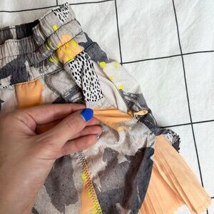 Lululemon orange and grey printed running shorts with a micro pleat side panel and a size zipper pocket. Shorts are lined with a small internal pocket as well. Elastic in waistband.