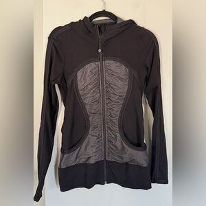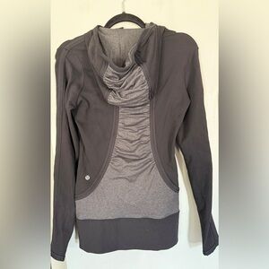 Stylish black and gray hooded jacket with a zip-up front. Features a unique ruched design.