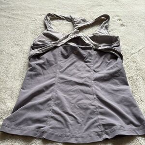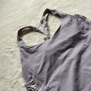 Keep it sleek and functional with this Lululemon racerback athletic tank top in a muted lavender-gray tone. Designed with a flattering, fitted silhouette. The built-in bra and supportive cross-back straps make it ideal for low to medium-impact workouts like yoga, barre, or pilates. Crafted from breathable, sweat-wicking fabric to keep you cool and comfortable all day long. A versatile must-have for any activewear collection!