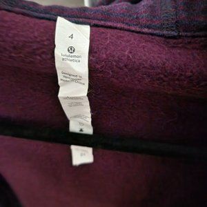 Stay warm and stylish in this pre-owned Lululemon purple stripe hoodie sweater designed for women size 4. Made of a cozy fleece fabric with stretch, this full zip hoodie features slit sleeves, easy care, and an embroidered Lululemon logo. The vintage details and striped pattern make it a unique addition to your activewear collection.