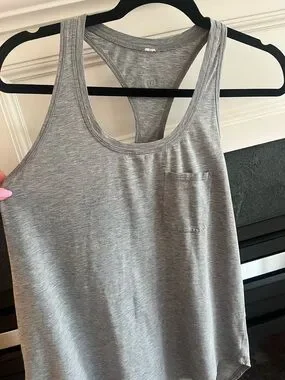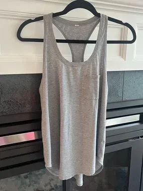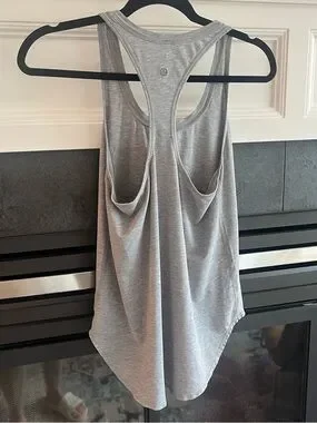 Light gray racerback tank from lululemon athletica. Soft, breathable fabric with a relaxed fit. Simple scoop neckline and sporty back. Versatile for workouts or casual wear.