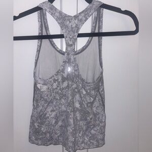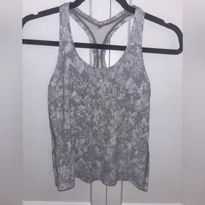 Lululemon racerback tank top in a grey patterned print. Soft, breathable fabric with stretch — great for workouts, yoga, or casual wear. Never worn