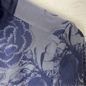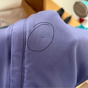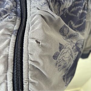 Good preowned condition - some signs of wear. Floral side has small hole near zipper. Not very noticeable due to gathering. Solid side has pin hole near pocket. Logo has wear and peeling. Please see photos.
