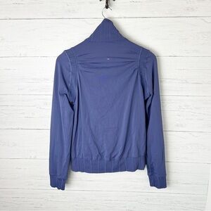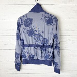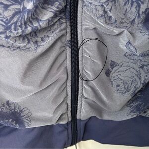 Floral side has gathering along front zipper, adjustable tie back, ribbed collar and cuffs, and mesh type fabric