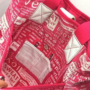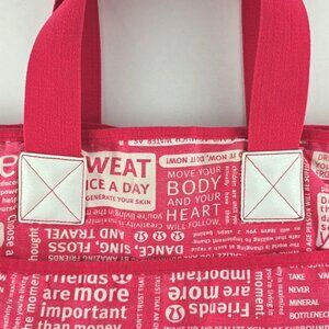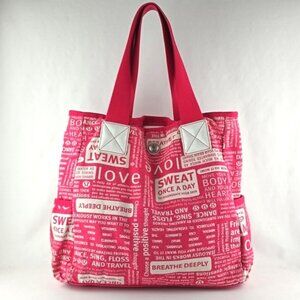 Go pre-owned condition, Lululemon rare large manifesto canvas shoulder tote / gym / travel bag in pink with all over white print plus washable matching pouch.