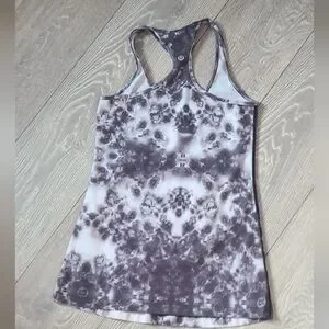 Lululemon Razorback Top. Gently worn, attractive grey/white pattern, no tags but would say Lululemon size 6/8. Very good condition
