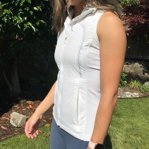 Some yellowing from wear. Perfect for layering on cold runs, or everyday wear. Includes front pockets and one back pocket.