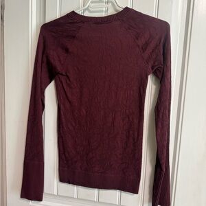 Chic maroon long sleeve top. Soft fabric with subtle texture. Ideal for layering or solo wear.