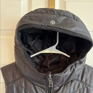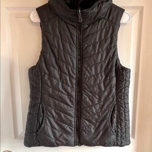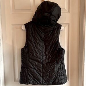 Stylish black quilted vest with a hood. Perfect for layering. Down filled.