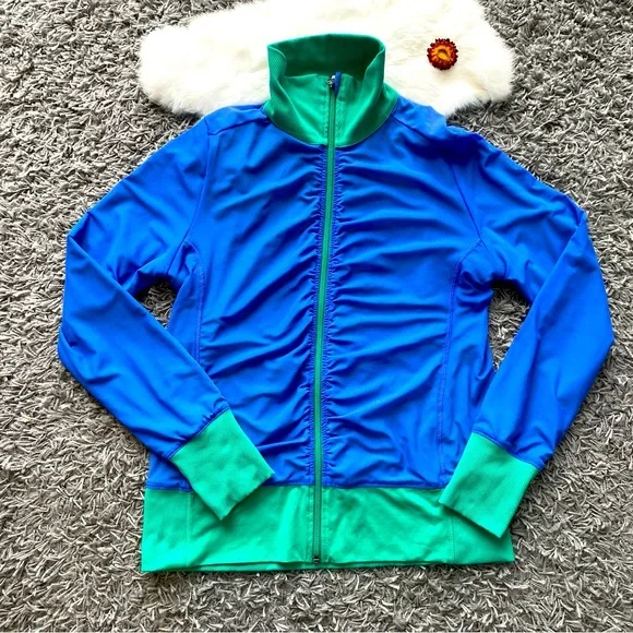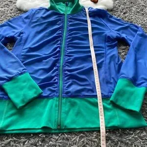 Details: The jacket has a full-zip front, a high collar for added warmth, and thumbholes on the long sleeves. The green side features two front pockets, while the blue side has a stylish ruched detail along the zipper.