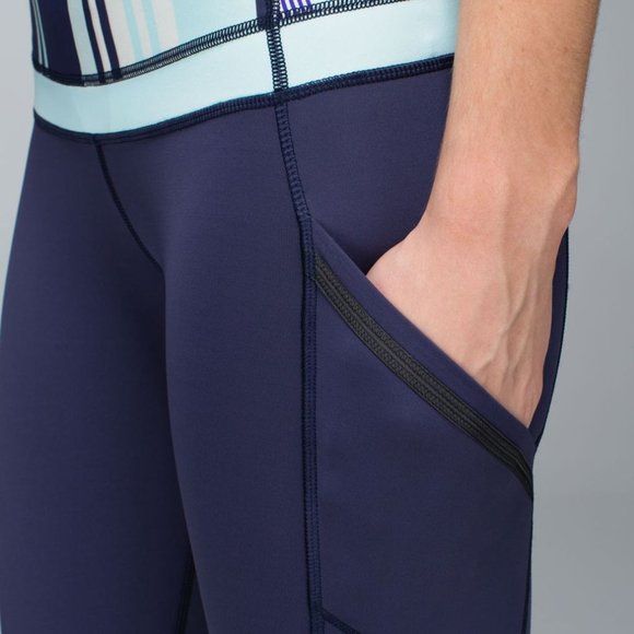 Key features include: Made with Luxtreme fabric which is breathable and sweat-wicking with four-way stretch; Full-On Luxtreme fabric back panel provides great coverage where you want it; angled hem with elastic grip designed to stay in place; strategically placed Mesh in high sweat areas helps to keep you dry; a continuous drawcord to gives you support when you need it; reflective details add visibility in low light; pockets galore: four hidden waistband pockets, a back zippered pocket, and two pockets at the hip; and flat seams to help prevent chafing.