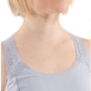 This is a grey and white pinstripe running tank top by Lululemon with body-mapped perforation helps you blow off steam. Long length covers your rear and is great for layering over running tights, while reflective details help with visibility in low light.
