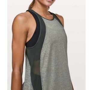 Lululemon athletica Run Off Route tank top. Olive green, heathered grey & a touch of silver in the grey. Women size 8US. Loose fit. Some parts are mesh as seen on picture. Size 8 according to measurements. No stain, no rip. Non smoking house.