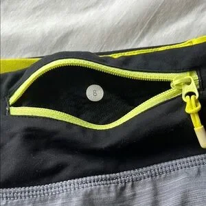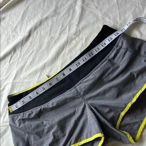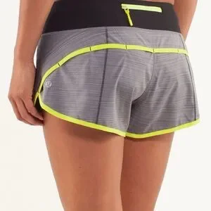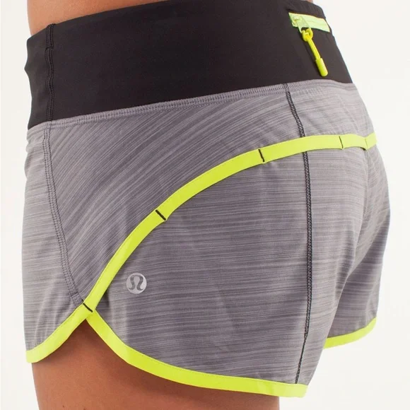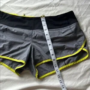 Experience ultimate comfort and style with lululemon athletica's athletic shorts, designed in a sleek gray with vibrant yellow accents. These shorts are crafted for performance with a lightweight, stretchy fabric and a curved hem for ease of movement. Perfect for running or training, they feature a wide elastic waistband for a secure fit.