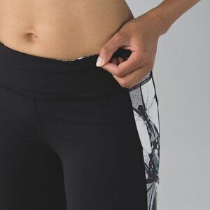 Size 6 Lululemon Run The World 7/8 Tight in Black/Exploded So Fly Butterfly Angel Wing Black/Wee Stripe Black Heathered Black.