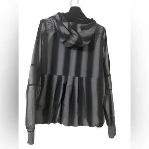 Striped jacket with hood. This has 3 small burn marks (see photo) but it’s so hard to notice due to the colour. Zipper and drawstring are in excellent condition otherwise. I love this and I would keep it except that I just don’t reach for it anymore.