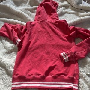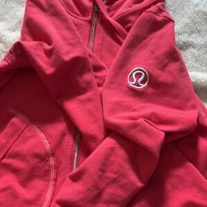 Turn heads in this Lululemon Scuba Zip Hoodie, size 6 (fits like Medium), in a vibrant pink and white colorway. Made from a soft blend this hoodie features a full-length zipper, structured hood with drawstrings, and ribbed cuffs and hem with sporty white stripes.