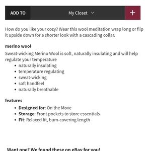Sit in lotus wrap II by Lululemon in color black cherry. In perfect condition, no flaws, pulls or pills. Size 8. Pit to pit is approximately 22". Rip tag removed. Merino Wool.
